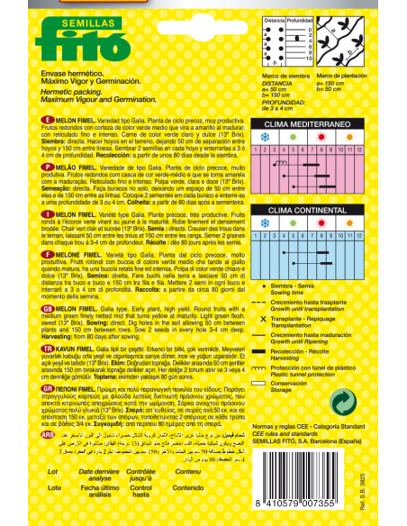 Galia type. Early plant, high yield. Round fruits with a medium green finely netted rind that turns yellow at maturity. Light green flesh, sweet (13ª Bix).