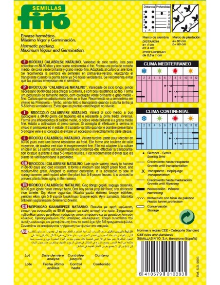 Late cycle variety, ready to harvest in 80-90 days and cold resistant. It forms a medium size bright green floret, and medium-fine grain. Adapted to outdoor cultivation. It grows well in sunny, well fertilized and irrigated land, with high organic matter content. It is advisable to sow in spring-summer, and replant when the plant has 5-6 proper leaves. It is advised to prevent plants from aging in the nursery.