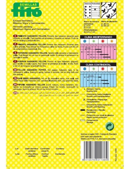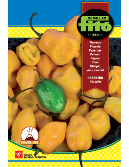 Hot pepper, habanero type, to be harvested in yellow. Sowing in spring, harvest in summer. 3-4 cm long fruits and thin pedicel