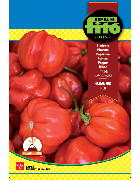 Hot pepper, habanero type, to be harvested in red. Sowing in spring, harvest in summer. 3-4 cm long fruits and thin pedicel