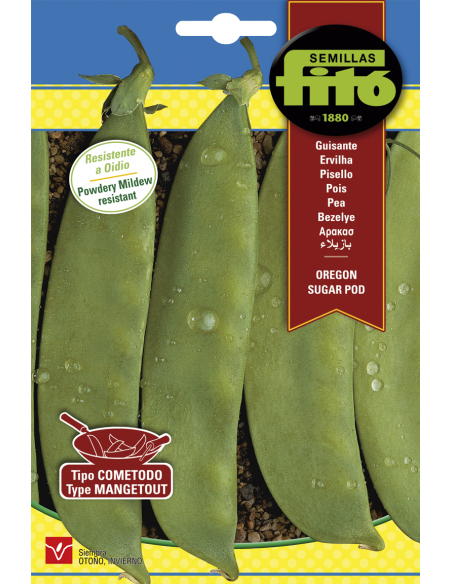Pea medium size. Plant with a height of 75 cm and white flowers. This variety is resistant to powdery mildew and very productive. Mangetout type pods that are 9-10 cm long and 2-2.5 cm wide. Ideal for raw consumption in salads or sauteed in a wok. Sowing: directly. Sown in autumn/winter.